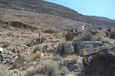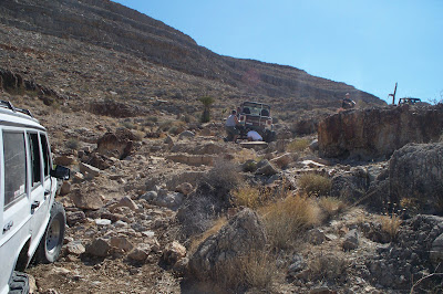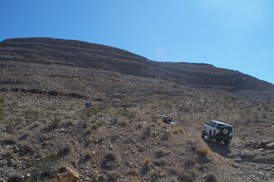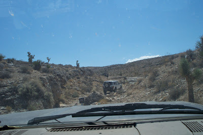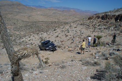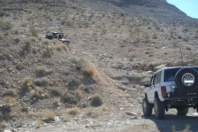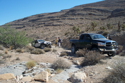 We did do more than eat this weekend, we finally got the Jimmy out to the desert. I'm happy to report the truck handled like a champ. All of Frank's hardwork was worthwhile and well done. On Sunday, we met up with Vegas Valley Four Wheelers to do Tie Rod Canyon. It was a great trail, it offered a few great obstacles and bypasses for those not fully equipped. The trailhead is near Rainbow and Blue Diamond, it's by a trail Frank and I have taken to Sloan. Tie Rod lets you out at the same place, but it takes a different, more challenging and more fun route.