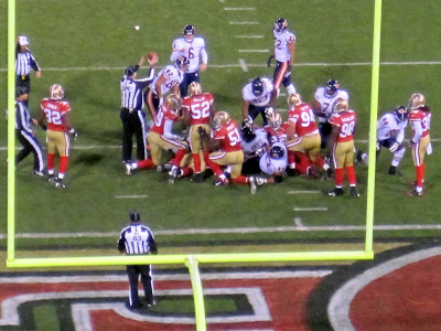 Next, the coin-toss then the game was on. The first half flew by despite no major plays being made. Crowds were in good spirits. Lots of razzing and cheering! 49er fans are much more passionate about their team, than Angel fans in Anaheim. That was good to see.
