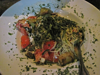 Then we shared our entrees, angel hair pasta and jerk chicken & shrimp stack. The pasta is one of my favorite dishes. Eggplant, tomatoes, basil, garlic, feta and pine nuts. It was our first time having the jerk chicken. It was likely the most tender and flavorful piece of chicken I ever tasted. It was good. The shrimp enchilada was too. Frank liked the chili sauce best, but I preferred the tomatillo.