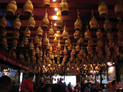 We paid our tab and then walked down India street about a block until we arrived at Filippi's Pizza Grotto. It hugely popular. We waited about 20 minutes in a single-file line for a table. We were seated and couldn't help but take a photo of the empty wine bottles that hang from the ceiling.