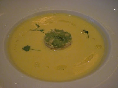 Then, we were offered breads: Italian and sourdough, both were warm and fresh. I preferred the Italian. After noshing on breads, we were brought our appetizers. Frank had bibb lettuce salad with Maytag Blue Cheese, Summer Corn, Bacon, Red Wine Vinaigrette. It was fresh and delicious, the vinaigrette was fantastic. I had the Heirloom Tomatoes Gazpacho with Spiced Crab Salad, Avocado, Summer Herbs. It was like biting into a fresh tomato only I was slurping it off a spoon. Yum. The crab salad was excellent, too.